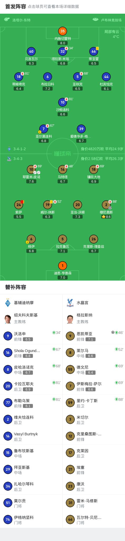 第31分钟,皮诺传中,穆尼奥斯头球破门,水晶宫1-0基辅迪纳摩